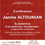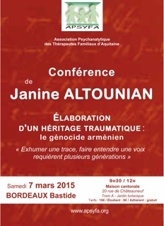 16 mars 2015L’Association Psychanalytique des Thérapeutes Familiaux d’Aquitaine organise une conférence avec Janine Altounian le 7 mars à Bordeaux : Elaboration d’un héritage traumatique – Le génocide arménien : » Exhumer une trace, faire entendre une voix requièrent plusieurs générations « .
